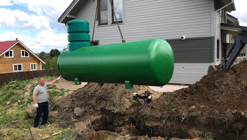 Серьезные земляные работы. Для установки емкости 5000 л требуется котлован значительных размеров. Мы используем специализированную технику, обеспечиваем идеальную песчано-бетонную подготовку и надежное анкерное крепление.